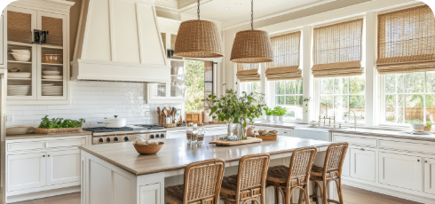 Woven Wood Shades and Bamboo Shades combine natural beauty, texture and functionality. Eco-friendly and durable, they filter light, provide privacy and improve energy efficiency, adding warmth, style and a timeless organic touch.